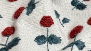okadayaで購入した『星あかりの刺繍手帖 ~巾着袋「木いちご」~』のキットを作成しました。途中で付属の糸を使い切ってしまったり、手縫いで巾着を作成したりと大変でしたが、刺繍をとても好きになりました。