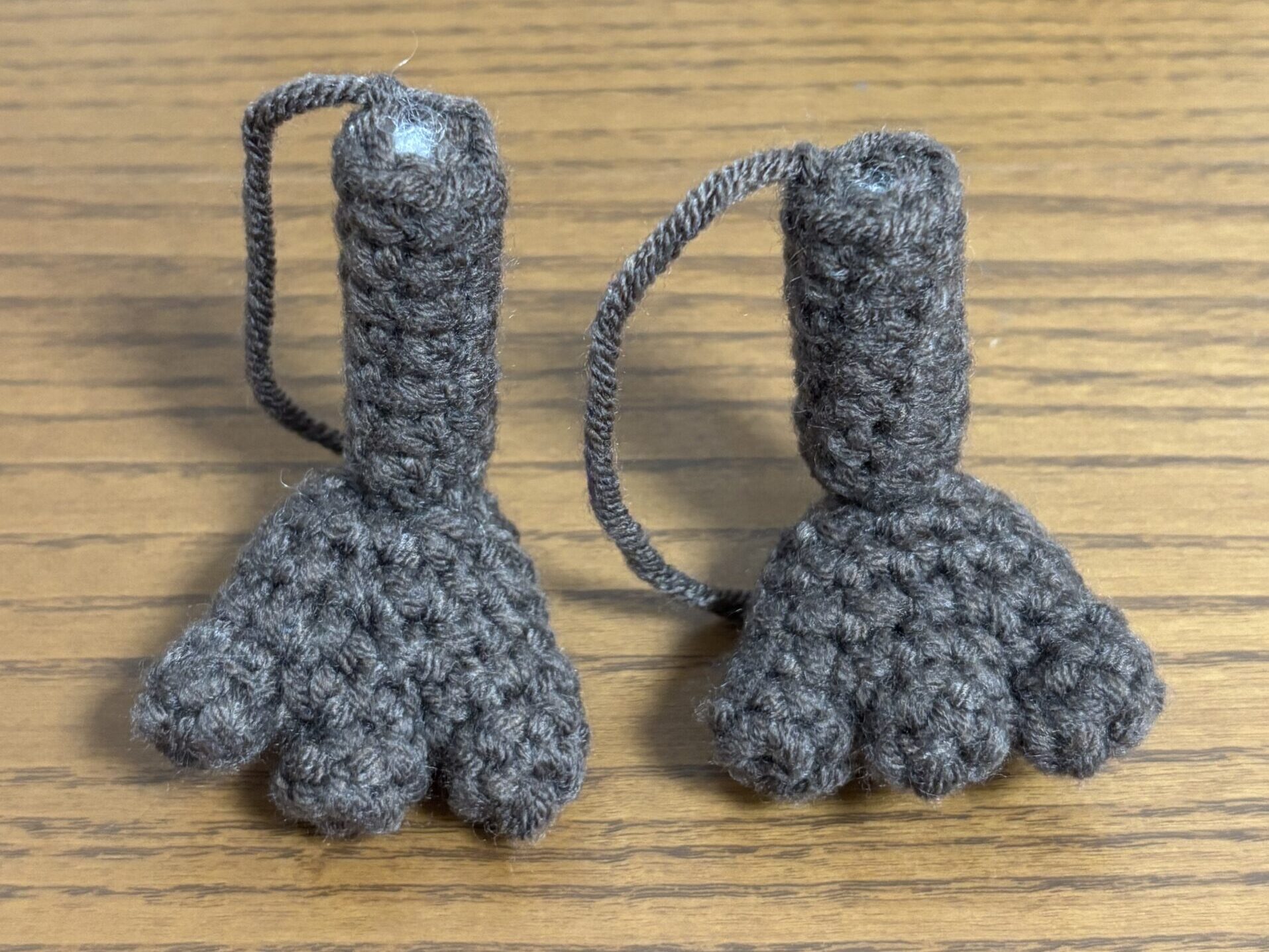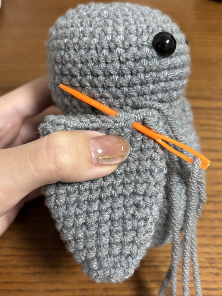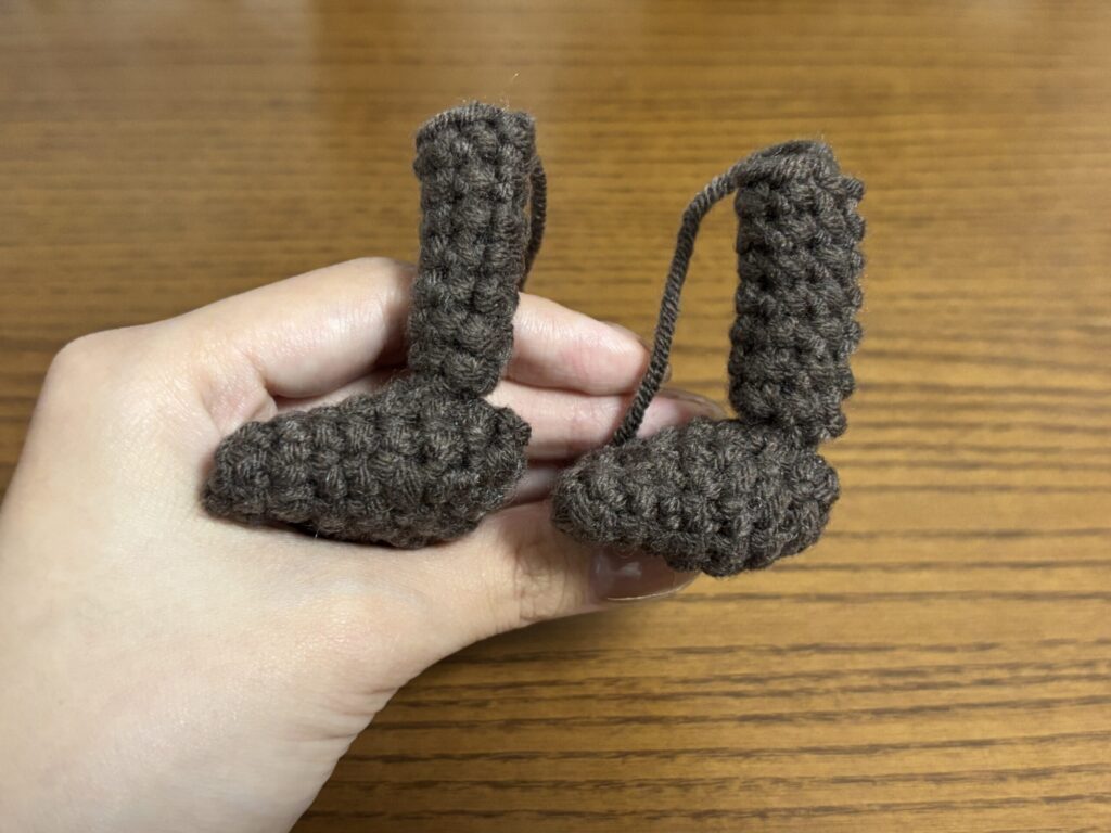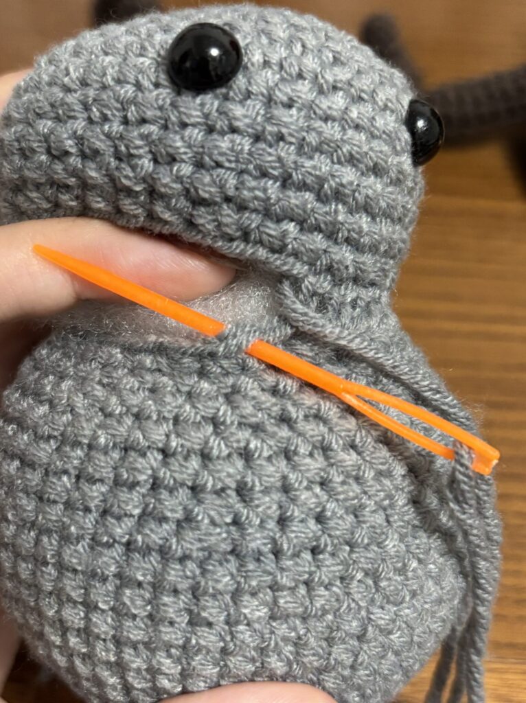編み図では”脚の1段目を足の6~7段目に縫い付ける”とありますが説明はこれだけでした。