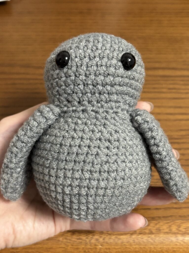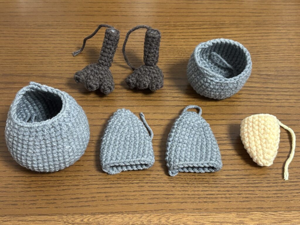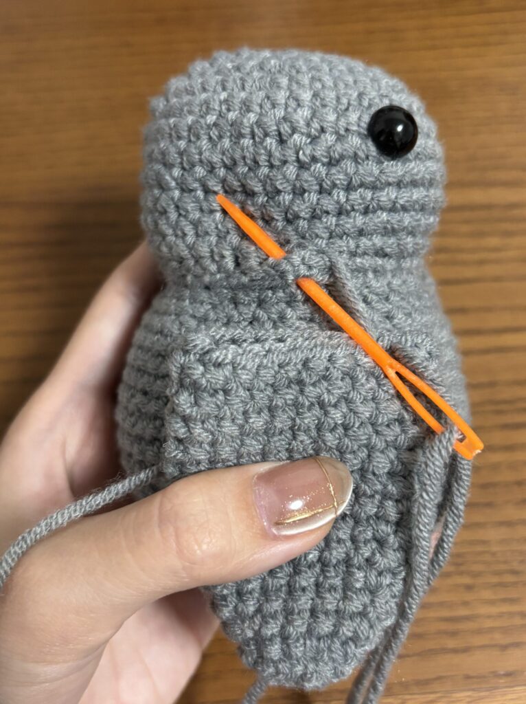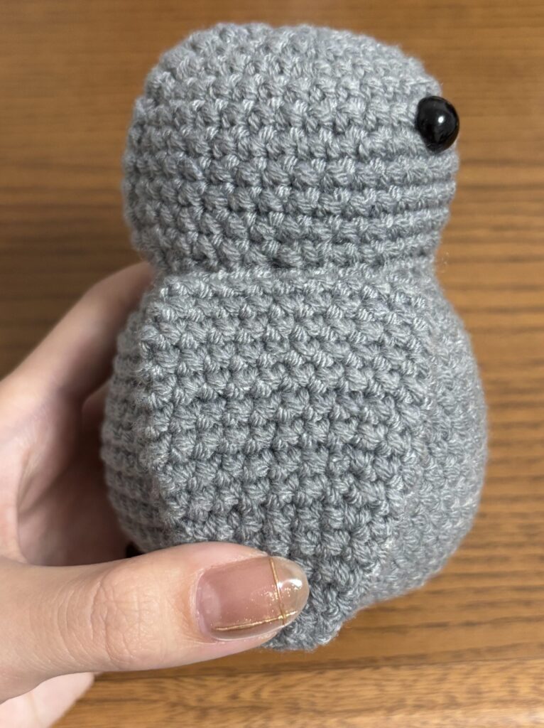 羽は編み終わりを平らにして胴体に縫い付けるので、編む部分が胴体側と外側の2重になります。