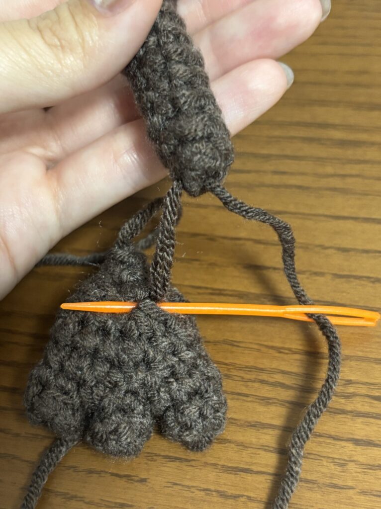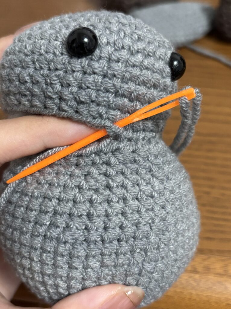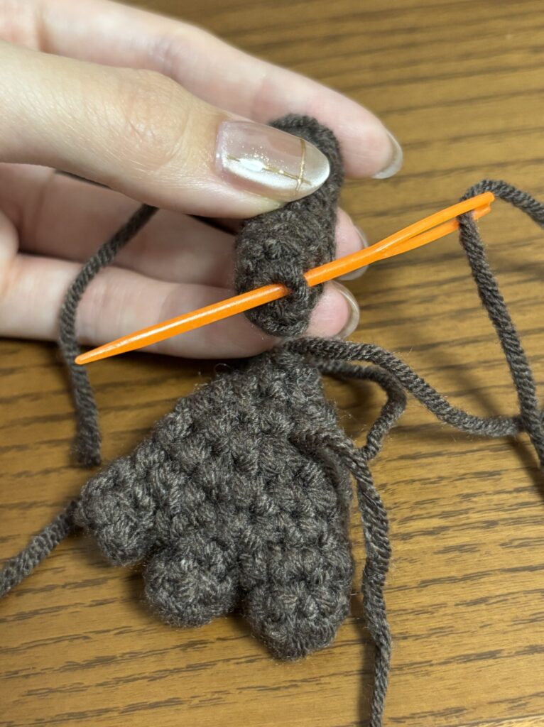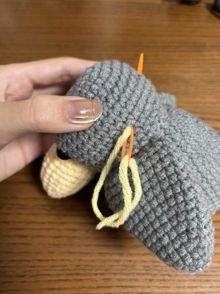 頭と胴体のつなぎ目から頭1段目に毛糸を通す。