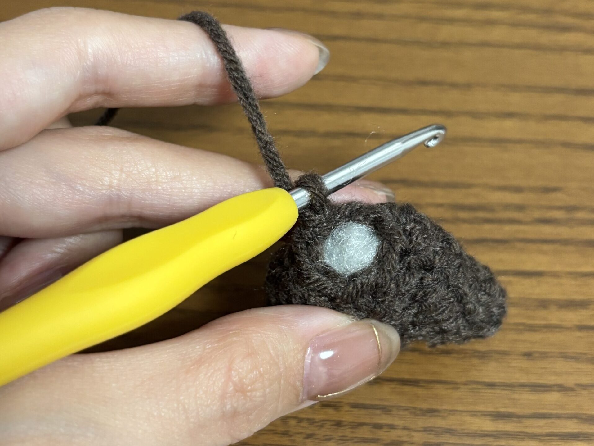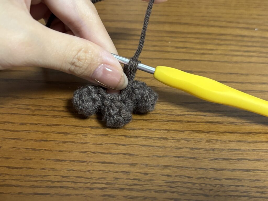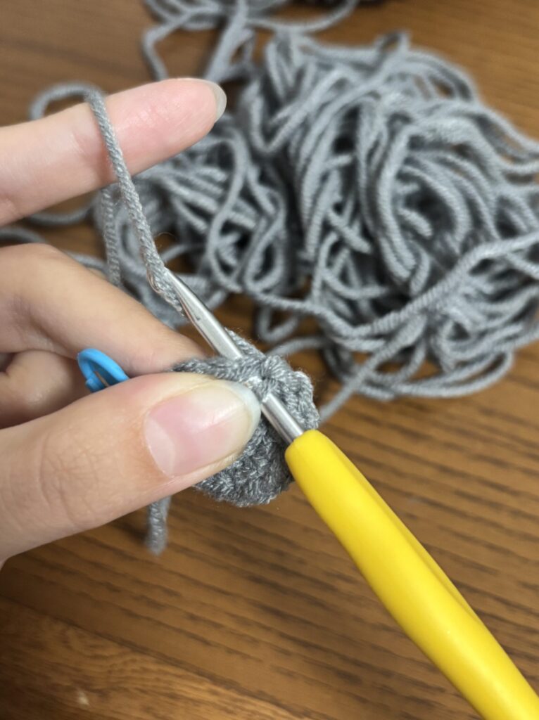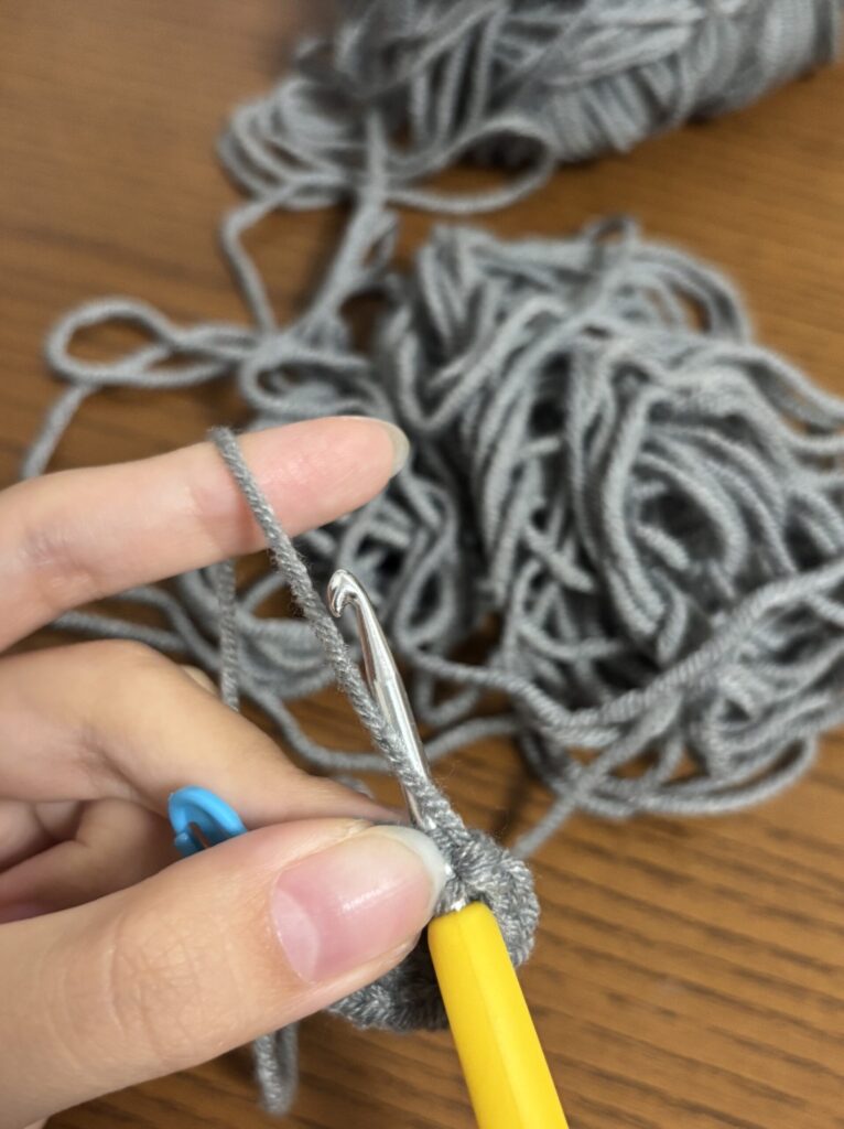 頭と胴体のつなぎ目から頭1段目に毛糸を通す。
