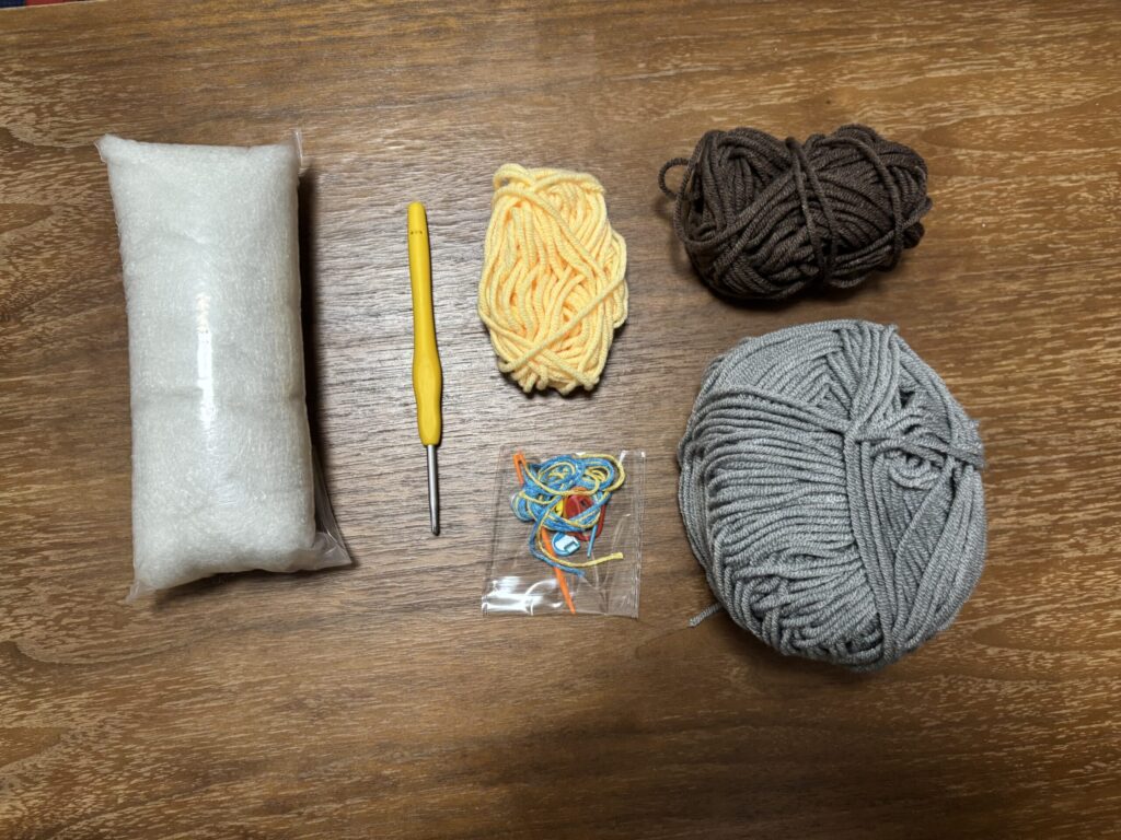 - 毛糸3種(グレー・茶・黄)